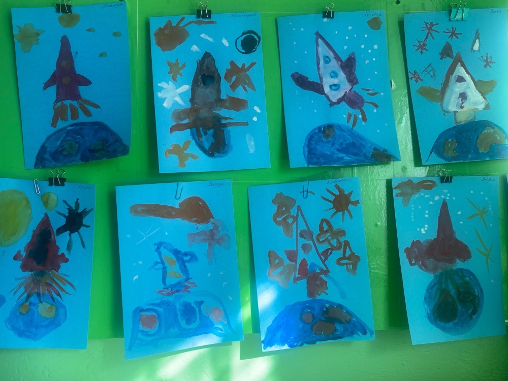 Знания, полученные на занятиях, дети закрепили в своих творческих работах и рисунках. В группах были оформлены выставки детских работ, посвященные Дню космонавтики.