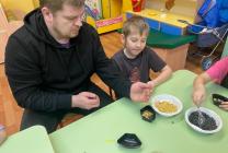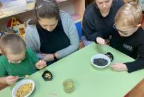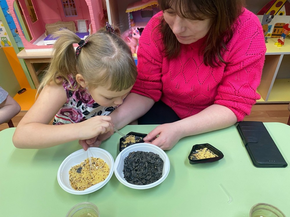 Сначала родители рассказали детям о птицах, используя интерактивные карточки, включающие в себя, помимо описания птицы, ещё куар-код с голосом этой птицы. Дети слушали голоса птиц, а потом вместе с мамами и папами, под руководством воспитателей сделали экокормушки.