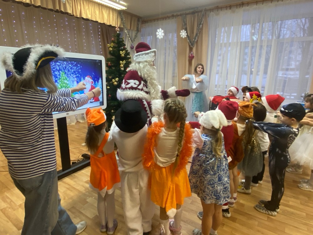 В гости к ребятам пришли Зимушка-Зима, пиратка Лора, и, конечно же, Дед Мороз! Захватывающее новогоднее приключение со сказочными героями очень понравилось детям. Ребята приняли участие в видео-разминке и космической видео-игре «Бегалки», играли со снежками, исполнили новогодний игротанец, победили пиратку в игре "Моталочка". В завершении праздника дети исполнили веселые танцы вместе с Дедом Морозом и получили долгожданные подарки, которые им выдал волшебный чудо-аппарат!!!