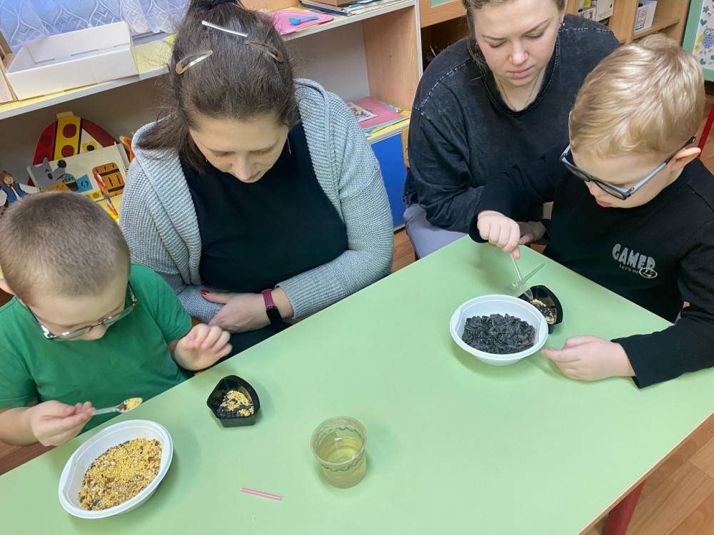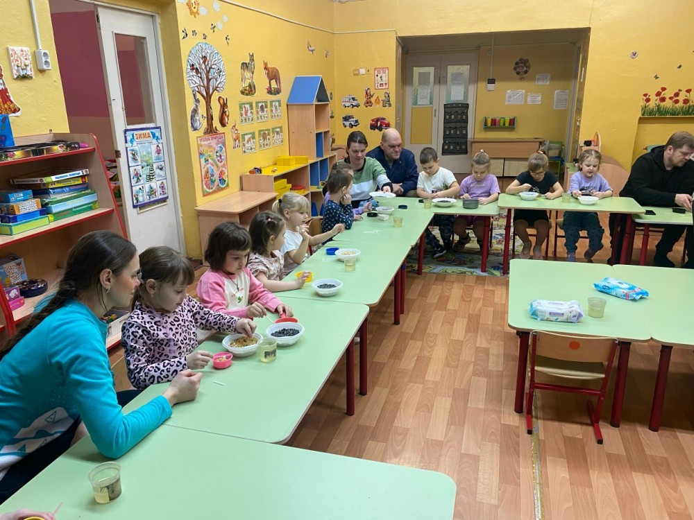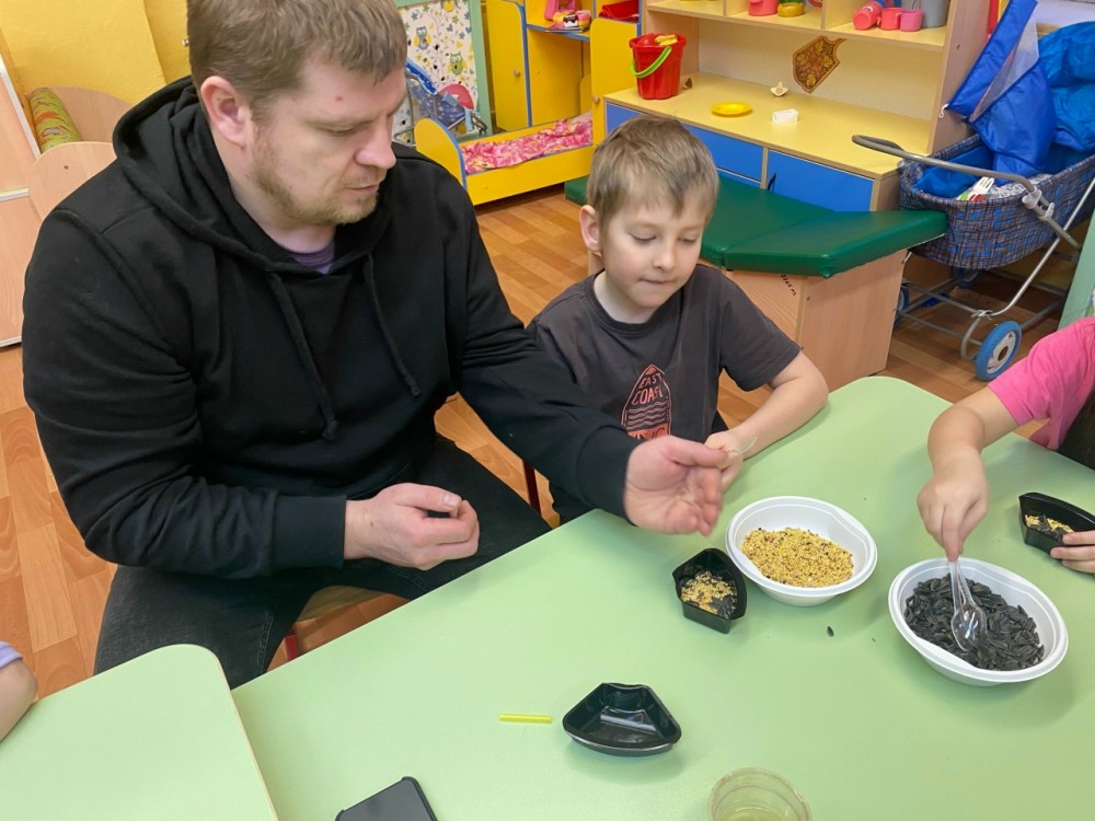 Сначала родители рассказали детям о птицах, используя интерактивные карточки, включающие в себя, помимо описания птицы, ещё куар-код с голосом этой птицы. Дети слушали голоса птиц, а потом вместе с мамами и папами, под руководством воспитателей сделали экокормушки.